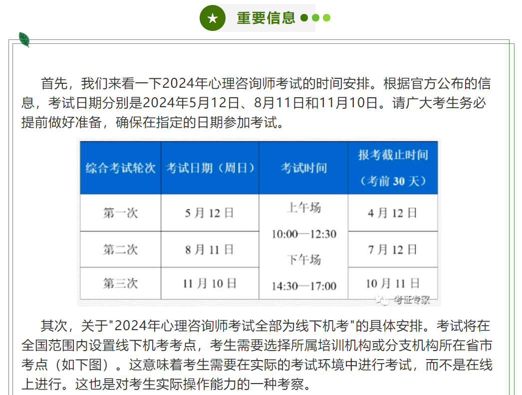 "注意:2024年中科院心理所心理咨询师考试全部为线下机考",这是中科院心理研究所《2024年度心理咨询基础项目综合考试安排》中的重要信息。本文将详细介绍2024年心理咨询师考试的时间、考点分布以及新的报考系统。
