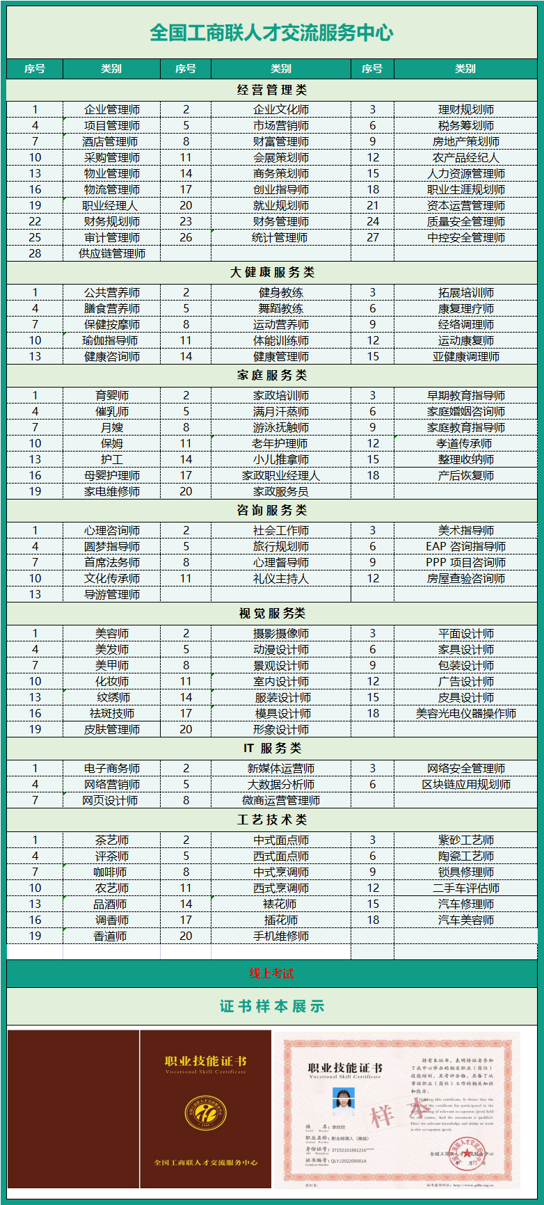 全国工商联人才交流服务中心成立于1995年,是经中央机构编制委员会办公室批准成立的国家级事业单位,全国工商联人才交流服务中心是全国工商联七个直属单位之一,拥有人才开发、人才培训、人才测评、人才推荐等职能。现在国际上的职业培训都是社会组织实施认证,也就是说全国工商联的证书,不仅全国工商企业认可,而且国际上都认可。
